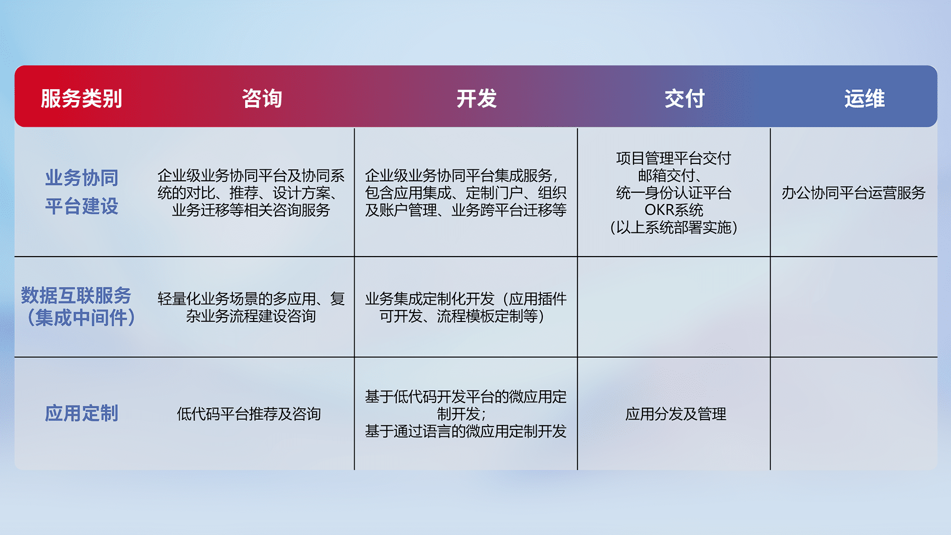针对钉钉、、企微、、IDaas等平台级产品提供产品的规划、、方案、、、、交付、、、、定制化开发等服务,,实现如统一协同办公、、、智能客户服务、、混合会议管理、、、、智能数据查询、、、、等业务场景,,,,实现数字化转型。。。