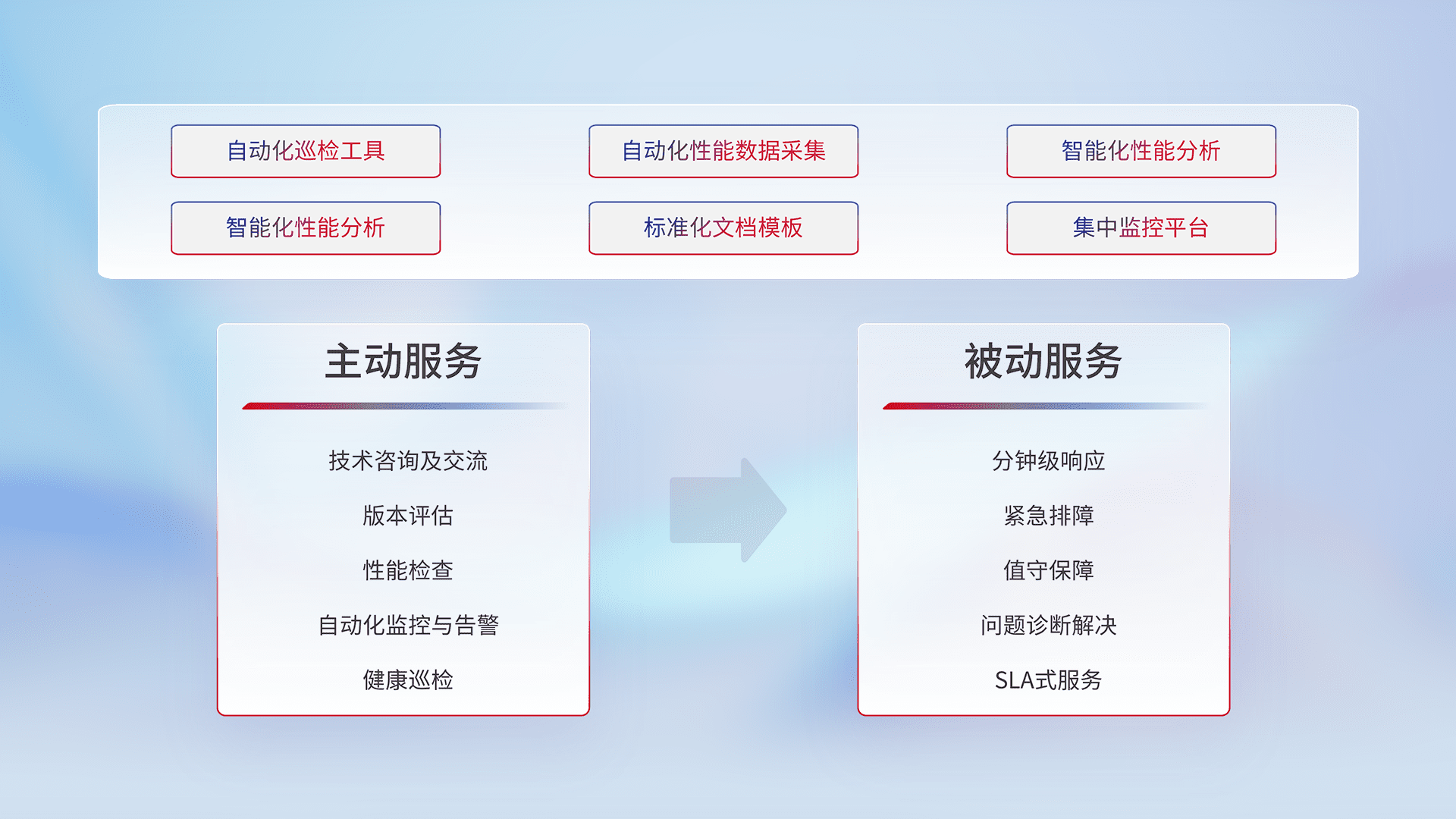 智能化工具和标准化文档,,,,保障服务质量,,提供主动服务(包含技术咨询、、、、版本评估、、、、性能检查、、自动化监控与告警、、健康巡检)和被动服务包含(分钟级响应、、、紧急排障、、、值守保障、、、问题诊断解决、、、SLA服务)。。