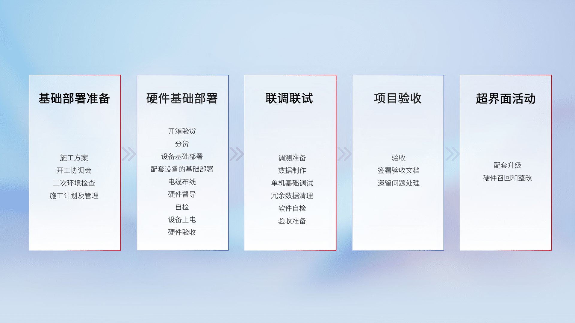 从基础部署准备、、、、硬件基础部署、、、、联调联试、、、项目验收、、、越界面活动的全过程可追溯,,,,保证施工质量和进度。。。。